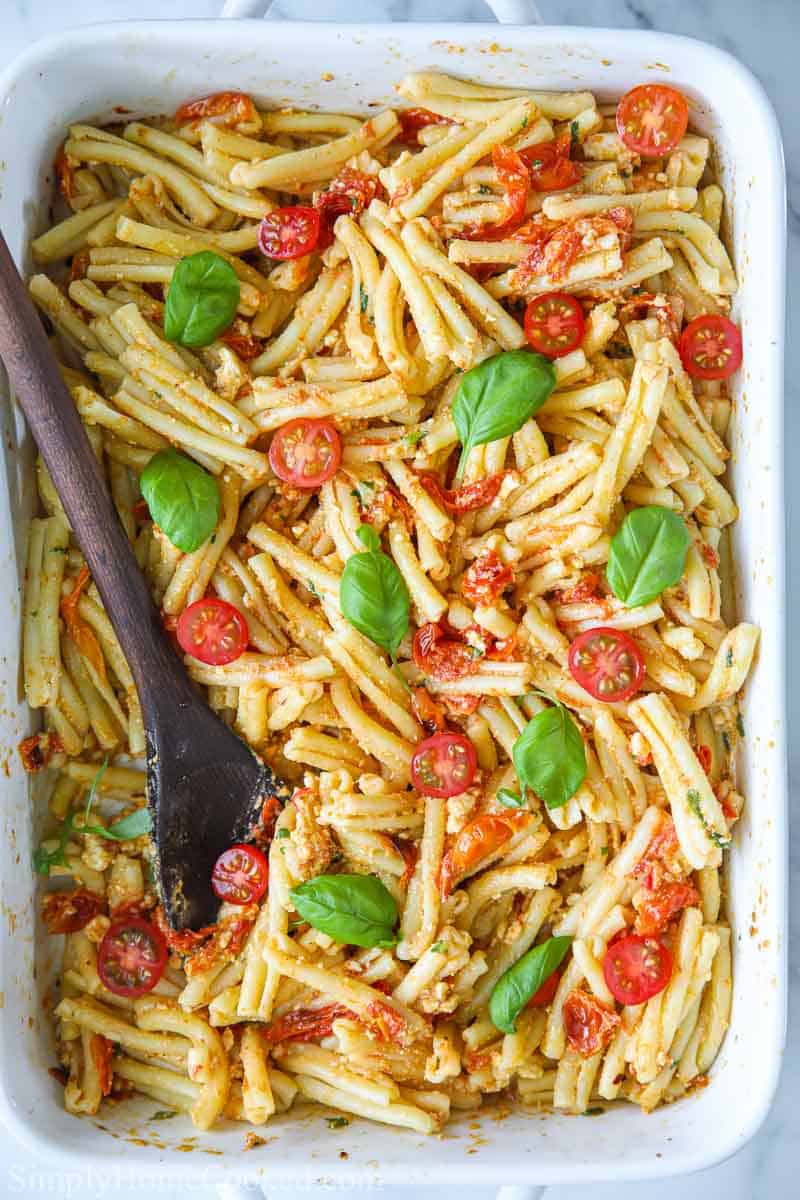 - Add the pasta. Add the cooked pasta to the baking dish and toss until it is coated in the sauce. Then garnish it with more chopped basil. Serve warm.