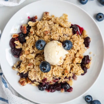 - Allow to cool slightly- With the insides extremely hot from baking, allow the blueberry crisp to cool a little before serving. This will allow it to hold its structure a bit more and avoid the ice cream melting into a puddle on top immediately.