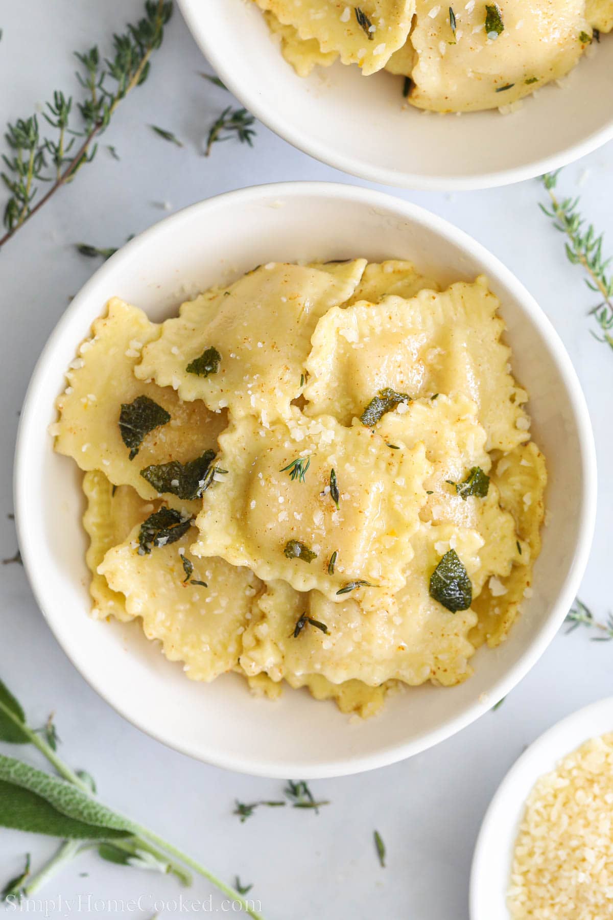 - Fresh herbs- Fresh sage and thyme impart an amazing amount of flavor, as well as being aromatics that enrich the scent of this delicious ravioli dish. These two go great with butternut squash.