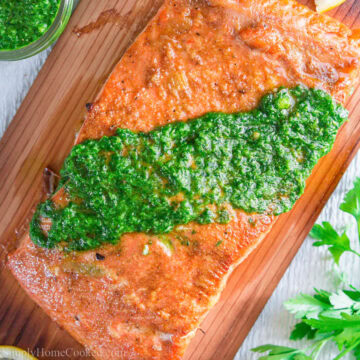 I love this Cedar Plank Salmon recipe because it makes these salmon fillets taste so utterly amazing. I like serving mine with a fresh and herbaceous chimichurri sauce to really bring out the flavor in the salmon.