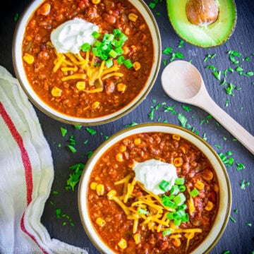 This easy beef chili is a simple and delicious as chili gets. Flavorful ground beef simmered with aromatic spices, beans, tomatoes, and whole kernel corn. This is comfort food at its finest!
