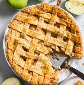 Apple pie is one of those desserts that is universally loved. Whether it’s a 4th of July picnic or a holiday dinner, homemade apple pie goes perfectly. With a gorgeous pie crust that is golden brown and flaky, and laid in a lattice pattern that looks beautiful, you can’t go wrong with this American favorite. Apples, sugar, cinnamon, and vanilla are just a few of the ingredients that make the gooey filling so yummy. Despite looking intricate, you really can make a lovely homemade apple pie without too much effort or time. And you’ll love the flavorful results! If you’re entertaining, this pie goes great with blueberry pie (with this blueberry pie filling), peach cobbler, and fruit pizza.