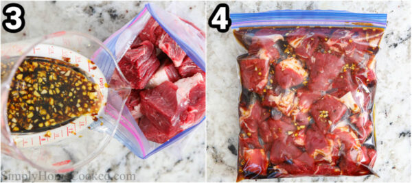 - Cut and marinate the steak. Cut about 1 1/2 lbs. of steak into pieces that are 1-2 inches thick. Place them in a ziplock bag with the marinade and then let them sit for at least 3 hours, or overnight.