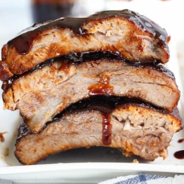 These Oven Baked Ribs are juicy, delicious, and fall-off-the-bone tender. Slathered in a homemade barbecue sauce, these ribs are full of sweet and smoky goodness.