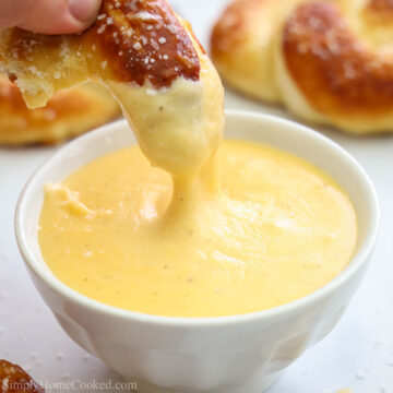 Soft pretzels are so good in cheesy mustard sauces like this Pretzel Cheese Sauce. The mix of tangy mustard, sharp cheddar, and spicy hot sauce goes really well with all pretzels.