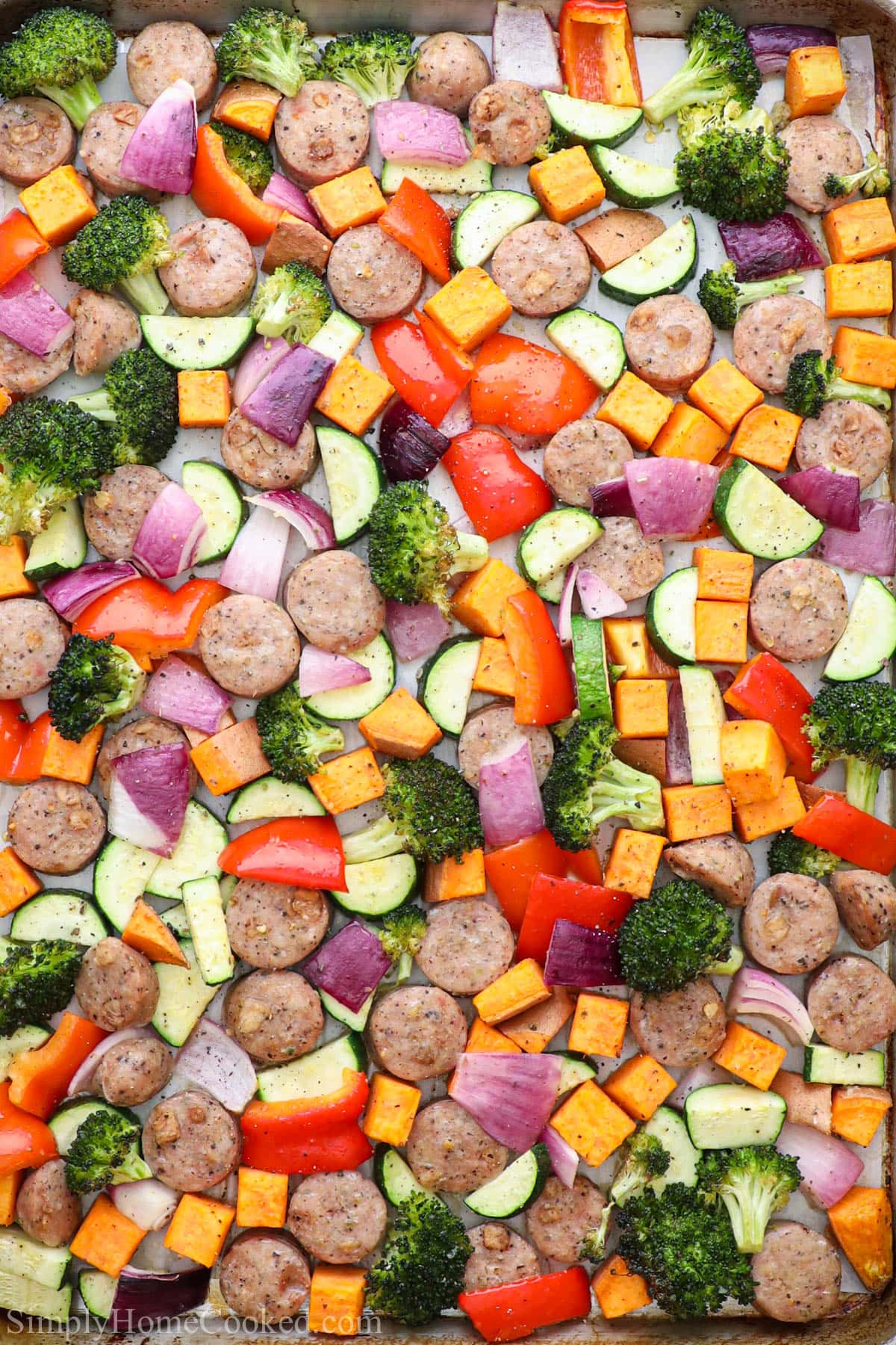 - Roast it uncovered- Leaving this Sheet Pan Sausage and Veggies uncovered places direct heat on the dish, giving it a delicious crispness.