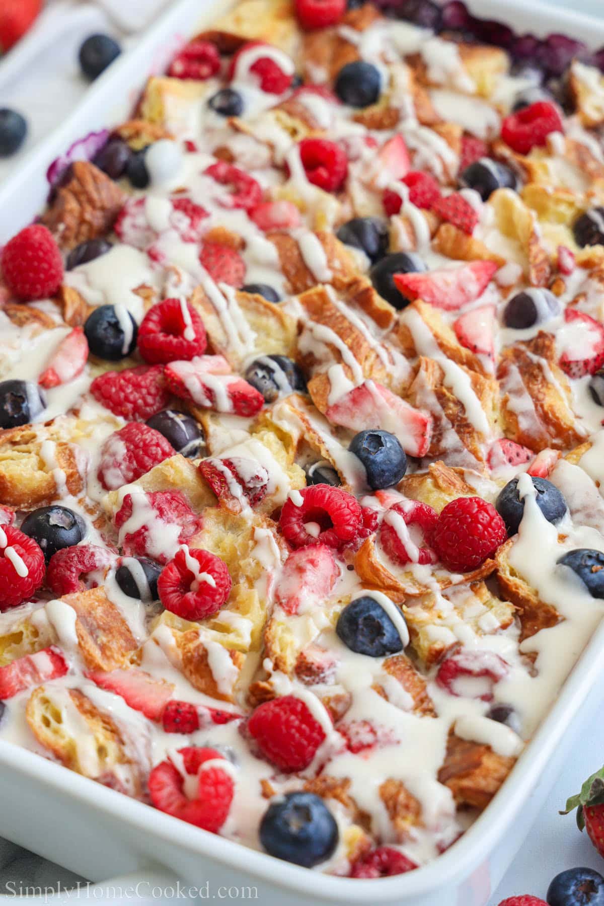 - Assemble in layers. Place half of the croissants into a 9×13 baking dish, then evenly scatter half of the berries on top. Then pour half of the custard evenly over the dish. Add the rest of the croissants in an even layer. Then add the remaining half of the custard and the remaining half of the berries. Lightly press the croissants and berries into the custard so that the top layer of croissants absorbs more of the custard. Cover with plastic wrap and refrigerate overnight.