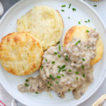 This homemade biscuits and gravy recipe is made with flakey buttermilk biscuits and a delicious (from scratch) sausage gravy! It's also super easy to make!