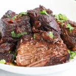 Add the red wine and water to the meat and place the lid on top. Place the pot onto the cooktop and bring it to a boil. Place the pot into the oven for 1 1/2 -2 hours at 350 Fahrenheit. Cook until the meat is fully cooked through and fork-tender. Note: if the meat still feels tough after 1.5 hours, you need to let it cook longer. Tip: Take a peek at the meat every so often... if the liquid dries out, add about 1/4 cup water.