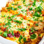 Cover with the remaining red sauce. Then sprinkle with about 1 cup of shredded Monterey Jack cheese. Cover with foil and bake for 45 minutes at 370 degrees Fahrenheit.