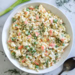 Then chop 6 hard-boiled eggs, 3 green onions, and 2 tablespoons of fresh dill. Tip: Use an egg slicer to speed up chopping the eggs. In a large bowl add the crab, shrimp, eggs, green onion, dill, corn, and peas.