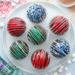Place the sealed hot cocoa bombs onto a parchment-lined baking sheet and decorate with melted white chocolate and your favorite holiday sprinkles. Makes about 6 (2 1/2 inch) chocolate bombs.