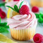 Using a decorating tip of your choice (I used Wilton 1M piping tip), pipe out the raspberry buttercream onto each cooled cupcake. Note: if your buttercream ended up a little runny due to warm ingredients, place it in the refrigerator for about 1 hour. This should help thicken the consistency. You can also add a little extra powdered sugar to thicken it up as well.