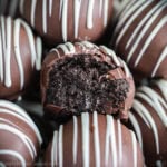 Once the Oreo truffles are set, melt 5 ounces of white candy melts into a bowl and then pour into a disposable pastry bag and snip off a small part of the end. Then drizzle the melted white candy melts over the Oreo truffles. Let them set for about 20 minutes before serving.