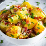 These crispy parmesan roasted potatoes are loaded with smoky bacon bits, fresh parsley, and pressed garlic. Every bite is perfectly golden crisp on the edges and tender-soft in the center.