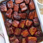 Trim a thin (top) layer of fat from the pork belly. Then cut it up into cubes that are about 1 1/2-2 inches big.