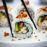 Now make the sushi rice according to the recipe. Then let it cool. Note: my sushi rice recipe makes 8 rolls. But you can cut this in half if needed. Finely chop 8 oz of imitation crab meat and place it into a bowl and mix it with 3 Tbsp of kewpie Japanese mayonnaise. Then set it aside. Now wrap your sushi mat in plastic wrap. This will make your life a lot easier than it comes to clean up.