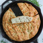 Now gently transfer the dough into your hot cast iron pan. Add a little drizzle of olive oil, and begin to poke the dough with all your fingers. You want to create many dimples