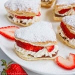 • Place the top half of the puff pastry heart on top and dust with powdered sugar. Repeat these steps with all of the puff pastry hearts. Serve within a few hours of assembling.